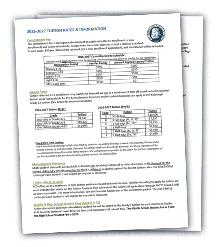 Applications for tuition aid (available for only K-12 students) are processed through FACTS(Note: Pre-K tuition does not qualify for tuition aid.)  CLICK HERE to access FACTS to submit your application for K-12 tuition aid; however, please note that your application for tuition aid will not be evaluated by the school until after your student has been accepted as a CCS student. (Your tuition contract will not be generated until your tuition aid application has been subsequently processed by the school if you have indicated on your application that you will be applying for tuition aid.)