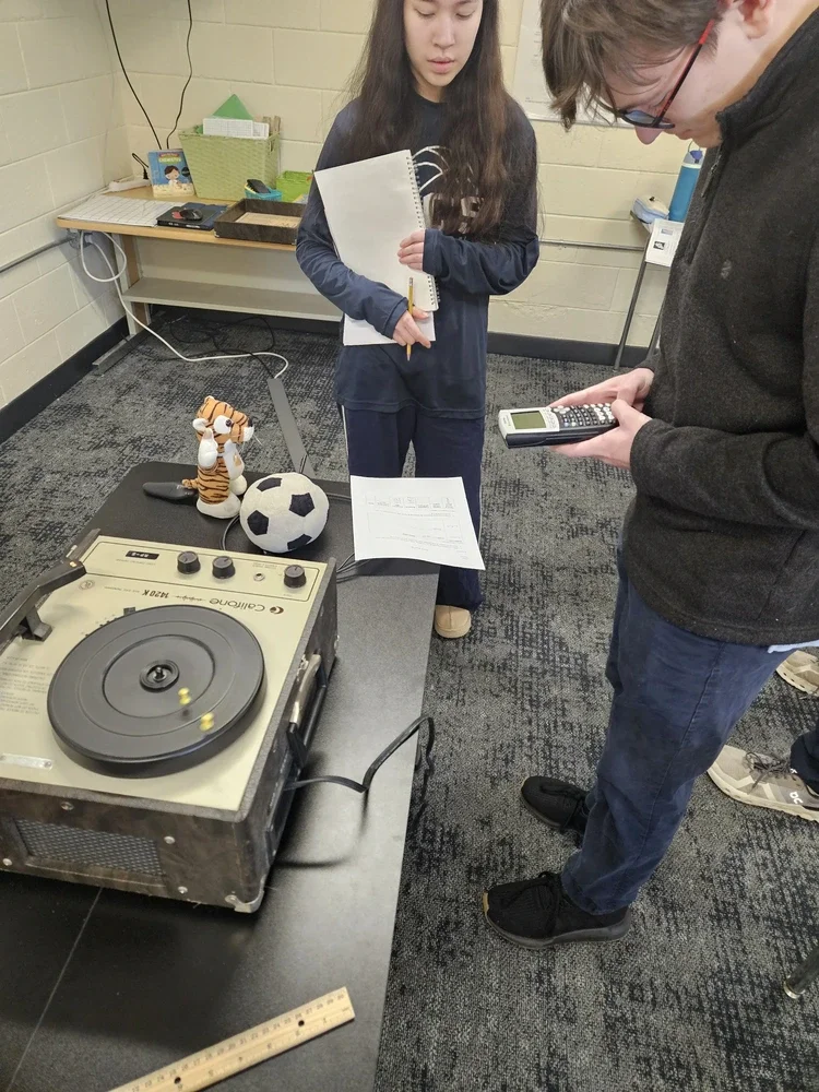 Students investigated how motion changes with radius by taking measurements at different points along a spinning platform. From there, they calculated tangential velocity, centripetal acceleration, and angular velocity. It’s the same kind of physics engineers had to consider when designing spinning media, where the read head moves closer to and farther from the center of rotation.
